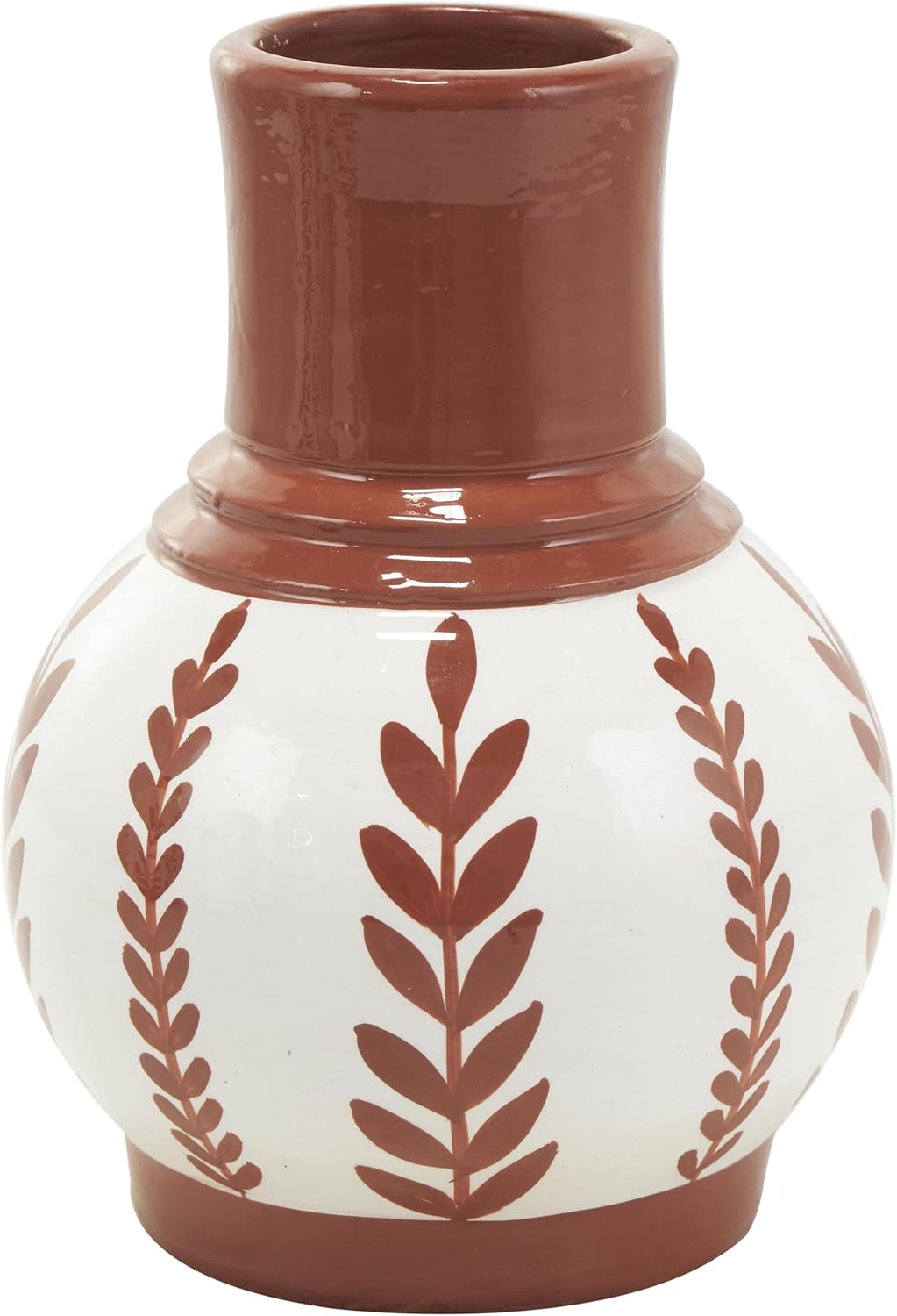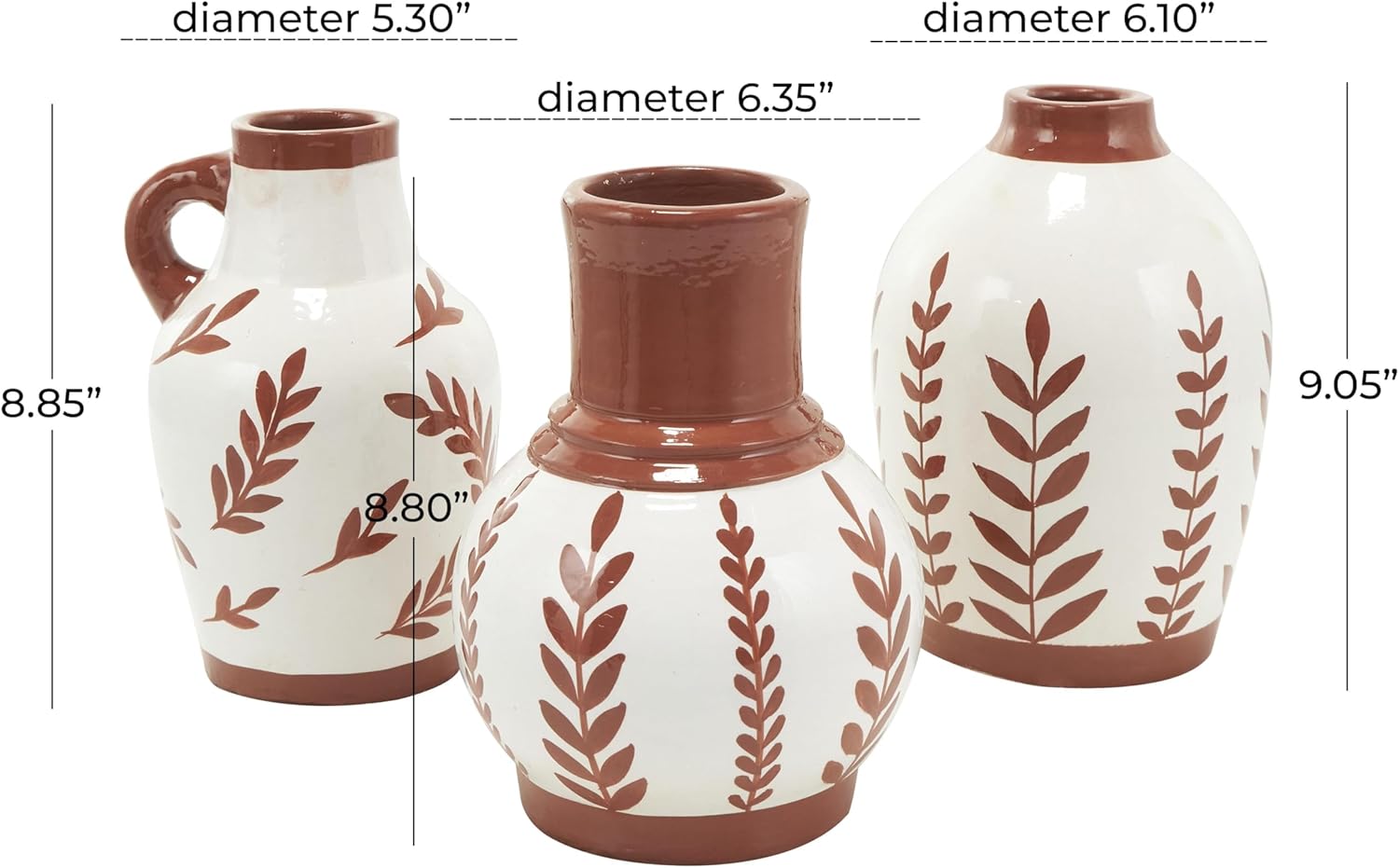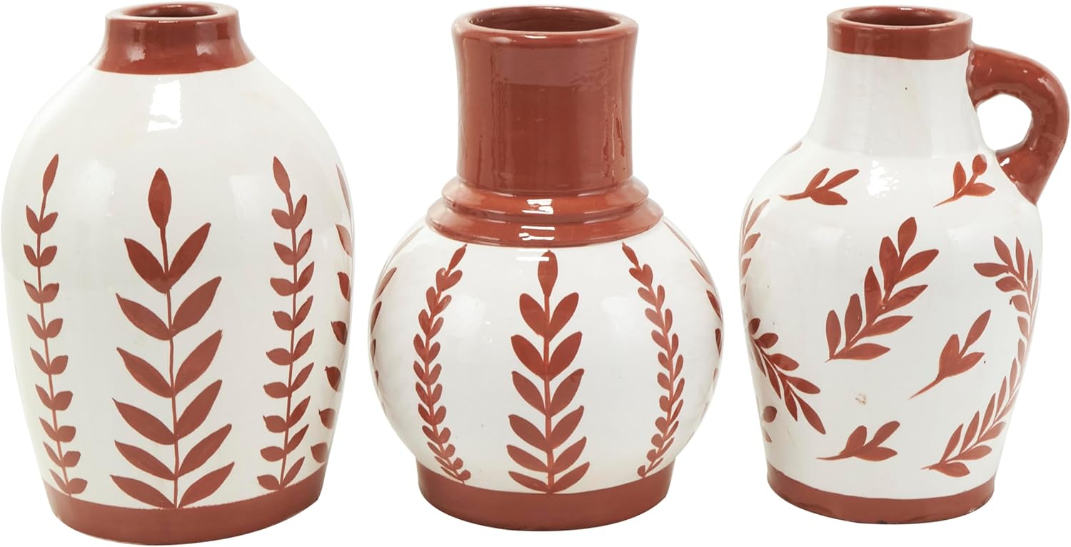 The Tuscan set of 3 vases for home decor showcases meticulous craftsmanship, each molded into a distinct shape and uniquely painted. The round shape and leaf designs of these polished white vases for faux flowers offers a classic and timeless look, while one vase has a little handle for added charm. Wipe clean with a dry cloth. Style the floral set of 3 centerpiece vases together as a cluster on a dining table or separately in different areas of the home, enhancing visual appeal. Designed with felt or rubber stoppers at the base that prevent scratching furniture and table tops, as well as sliding around. This item ships in 1 carton. Ceramic vase makes a great gift for any occasion. Suitable for indoor use only. This item ships fully assembled in one piece. Made in India. This white colored ceramic vase comes as a set of 3. Tuscan style. Vases have 2.50 in, 1.80 in, and 1.50 in mouth openings.